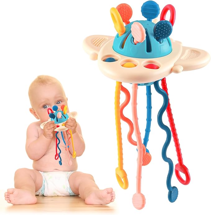 Dit montessorri trekspeelgoed is hier ook een hit bij onze peuter. Wij hebben dit als kraamcadeau gekregen, en inmiddels is er veel mee gespeeld. Ook dit speelgoedje bestaat uit één onderdeel, waardoor je niet telkens voor een stoplicht iets van de grond moet rapen. Hoogstens moet je dit hele apparaat oppakken. Daarom is het ideaal speelgoed voor in de auto of in het vliegtuig. Je kind kan aan de koortjes trekken en verschillende structuren voelen. Ideaal om een peuter onderweg te vermaken zonder scherm.
